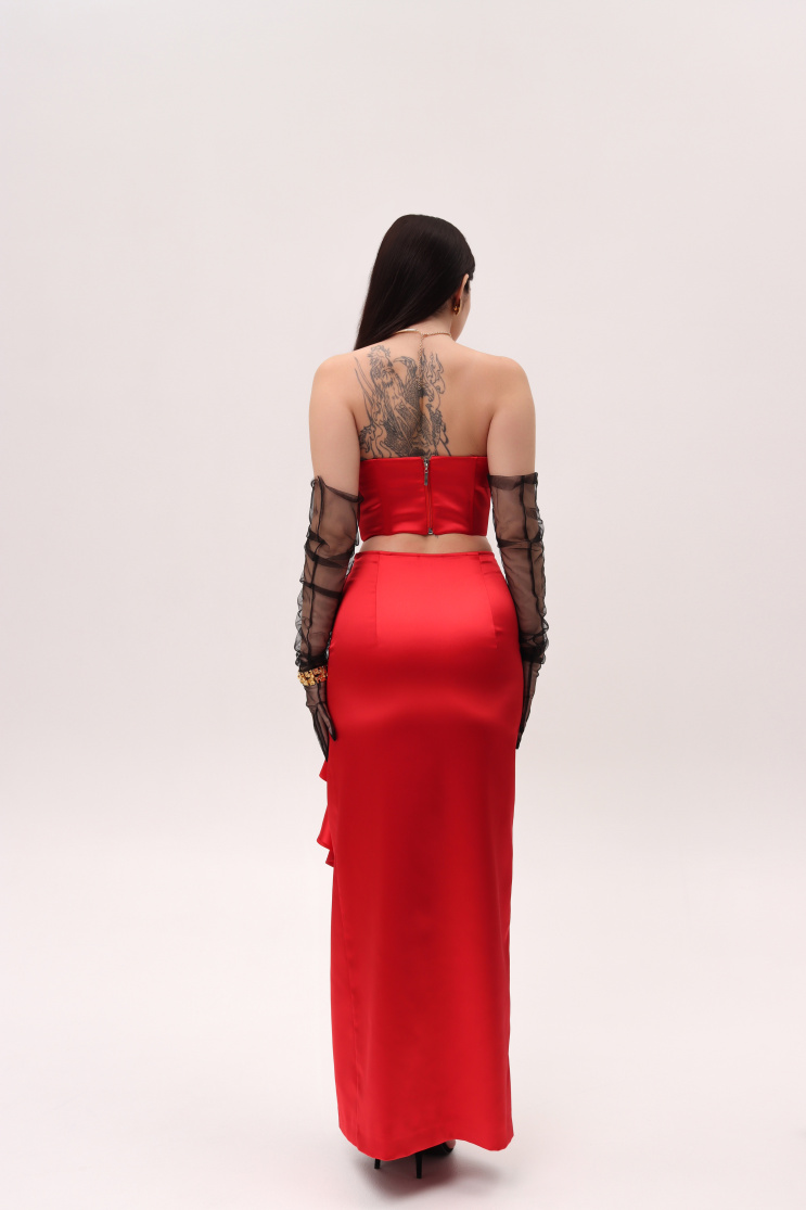 Описание Короткая юбка с оборками красная с принтом Для создания эффектного модного образа в жаркую погоду идеально подойдет эта короткая женская юбка, украшенная множеством оборок.